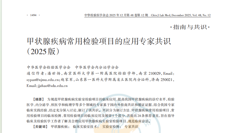 2025年12月— 为规范甲状腺疾病实验室检验的临床应用、提升诊疗水平,中华医学会检验医学分会与中华医学会内分泌学分会联合发布《甲状腺疾病常用检验项目的应用专家共识(2025版)》(下称“共识”)。该共识历时多轮专家论证,凝聚国内检验、内分泌、核医学、病理等多学科智慧,共形成28条推荐意见,为我国甲状腺疾病诊疗提供了首个跨学科、系统化的实验室检验指导框架。 甲状腺疾病是常见的内分泌疾病,我国成年人中临床甲亢、甲减、甲状腺结节等患病率不容忽视。多数患者在早期无明显症状,实验室检测成为发现、诊断与随访的关键手段。随着检测项目日益丰富、技术迭代加快,临床和检验科面临着项目选择、结果解读、质量管理等多重挑战。本共识的发布,旨在填补该领域系统性指导的空白,推动甲状腺疾病诊疗走向标准化、精准化。共识围绕甲状腺功能、自身免疫、肿瘤标志物及分子检测等常用检验项目展开,重点明确了以下临床路径与规范:甲状腺功能评估首选TSH:共识强调,在下丘脑‑垂体‑甲状腺轴功能正常的前提下,血清促甲状腺激素(TSH)是评估甲状腺功能状态的首选指标。建议选用功能灵敏度<0.01 mIU/L的第三代检测方法,以更好鉴别甲亢与非甲状腺疾病综合征。自身抗体检测助力鉴别诊断:甲状腺过氧化物酶抗体(TPO-Ab)、甲状腺球蛋白抗体(TgAb)与甲状腺自身免疫损伤密切相关;TSH受体抗体(TRAb)则是Graves病的特异性标志物。共识建议,在甲状腺毒症鉴别诊断中,应采用第三代方法检测TRAb。分化型甲状腺癌(DTC):甲状腺球蛋白(Tg)是术后监测复发、转移的关键标志物,推荐使用高灵敏Tg(hsTg,功能灵敏度<0.1 ng/mL)检测,并强调同时检测TgAb以排除干扰。术前Tg与TgAb检测可为术后随访建立可靠基线。甲状腺髓样癌(MTC):降钙素(Ctn)是MTC诊断与术后监测的核心标志物。共识明确,Ctn>10 pg/mL应高度警惕MTC可能,并建议对遗传性MTC家系进行RET基因突变筛查与定期Ctn监测。分子检测辅助结节良恶性判断:对于经细针穿刺活检仍无法明确性质的甲状腺结节,共识推荐进行基因检测(如BRAF、RET、RAS等),以辅助诊断与危险分层。关注检测质量与个体化差异:建立年龄与妊娠特异性参考区间共识特别指出,甲状腺检测结果易受年龄、妊娠、药物、疾病状态等多种因素干扰。为提升诊断准确性,共识强烈建议:建立年龄特异性参考区间:儿童、成人、老年人的TSH等指标参考范围不同,使用统一的参考区间可能导至误诊。例如,老年人TSH上限可适当上调,避免过度诊断为亚临床甲减。建立妊娠期特异性参考区间:妊娠期女性甲状腺激素水平发生生理性变化,需采用妊娠期特异的参考区间进行评估,以保障母婴健康。加强实验室质量管理:共识呼吁实验室基于生物学变异设定性能标准,并建立与临床科室的常态化沟通机制,确保检测结果准确、解释合理。共识强调,甲状腺疾病诊疗需要检验科、内分泌科、甲状腺外科、核医学科、病理科等多学科紧密协作。实验室不仅应提供准确的检测结果,还需主动参与临床沟通,协助结果解读与患者管理。共识建议有条件的医院组建甲状腺多学科诊疗团队,甚至设立院内甲状腺检验专家小组,实现从检测到诊疗的全程化管理闭环。共识在总结中展望,随着液体活检、多基因检测、人工智能辅助诊断等新技术的发展,甲状腺疾病诊疗将向更动态、更精准的方向演进。未来需加快建立基于人工智能的风险分层监测体系,完善区域性质控网络,推动我国甲状腺疾病整体管理水平迈向新台阶。该共识的发布,标志着我国甲状腺疾病实验室检验迈入标准化、精准化的新阶段,也为临床医生与检验人员提供了权威、实用的决策参考,最终惠及广大甲状腺疾病患者。本文基于《中华检验医学杂志》2025年12月第48卷第12期发布的《甲状腺疾病常用检验项目的应用专家共识(2025版)》进行整理报道,旨在传播权威医学知识,推动规范诊疗。