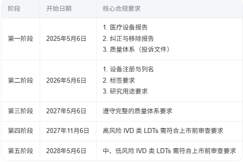 此前,FDA对大多数LDT采取“执法自由裁量”政策,不强制执行相关法规。但随着现代LDTs已变得高度复杂、商业化并在全美范围内使用,FDA认为其风险已远超过去,必须加强监管,并给出分期达成的计划表。