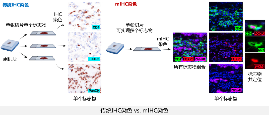 肿瘤微环境中出现了一类新的生物标志物,即空间表型特征,其通过mIHC技术可在一张组织切片上同时检测多种蛋白,全景展示肿瘤免疫微环境以及细胞间原位空间信息,解决了当前免疫治疗预测中尚未充分满足的临床需求。