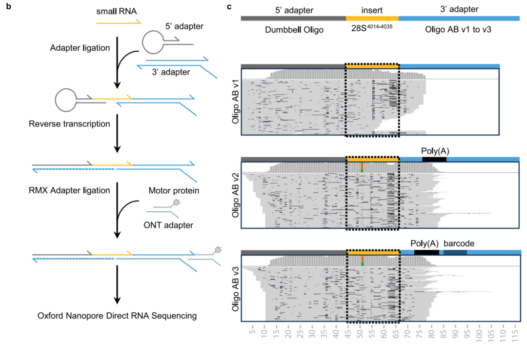研究人员设计了一种针对性的捕获策略,通过连接经过结构优化的dumbell Oligo 5’adapter,以及Oligo AB 3’adapter,将这个约22nt的超小RNA片段构建成兼容于牛津纳米孔平台(ONT DRS)的文库(下图b)。这是迄今为止在该平台上成功测序的最短的RNA分子。