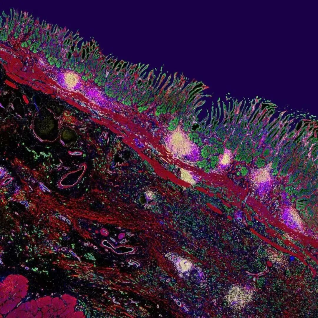 榕嘉生物自主研发Foresight® 空间组学平台。 大类上属于循环荧光染色,用DNA 标签代替了传统二抗;辅以杂交链式反应(HCR)做线性扩增,解决了国外主流DNA标签技术没有信号放大的缺陷;采用oligo 链洗脱条件温和,不会破坏样本,这也是目前淬灭和漂白技术的最大困扰。 目前每轮能测五标六色,理论无限轮,现已稳定做到12 轮,达到60标61色,国内技术最高水平。 艾克发生物,超多重空间蛋白组技术服务上新 引用艾克发AlphaXBio产品及服务的文章平均影响因子已达16+ 艾克发同时提供30色自主超多重空间蛋白组服务,以及与榕嘉生物的合作服务。 明虹天成,循环TSA及漂白迭代 基于循环TSA(Cyclic mTSA)以及漂白迭代技术,可高通量实现对常规临床石蜡切片的超多指标共标记(3-30靶标)。 爱博泰克,可切割荧光探针,25标26重 爱博泰克BioCanvas™ 超多重试剂,采用以可切割酪胺荧光探针 (CFP™) 为中心的多重策略,该策略允许染色、成像和荧光团切割的循环。 在每个循环中,多个蛋白质靶标首先被来自特异性的一抗识别。随后,用二抗和可裂解的荧光酪胺(CFT™)对第一个靶标进行荧光染色。HRP催化CFP与靶蛋白抗原上酪氨酸残基之间的偶联反应。成像后,荧光团以接近 100% 的效率,被特异性剪切试剂去除。通过重复染色循环,可以在单样本中,原位定量分析超多重靶蛋白。 每轮4个抗体,目前做到7轮,25标26重。 华大智造,24重多重荧光 传统的一抗+荧光二抗,温和洗脱,最大染色重数:24-plex。 茵菲空间多组学,以IMC为核心的空间多组学 迈维代谢,空间组学三次方 华盈生物,PCF与LCM-MS 华盈生物日前甄选了2025年发表的文章16篇,其中3篇有关空间蛋白组学。 华盈生物2025 —— 绘生命全景,解空间奥秘:以多维蛋白组学技术引领创新研究新范式! PCF空间单细胞蛋白组:复旦大学中山医院发表在《Cell》上的一篇文章,揭示了癌细胞通过ATF4-SLIT2-CGRP轴激活伤害感受神经元,远程重塑肿瘤引流淋巴结(TDLN)的免疫状态,从而逃避免疫监视的新机制,为联合神经调节和免疫治疗提供了理论基础。 PCF空间单细胞蛋白组,助力研究者发现了众多免疫细胞中,只有肿瘤相关巨噬细胞(TAM)和伤害感受神经元具有显著的共定位关系,为揭示“TAM激活伤害感受神经元”的机制假说提供了直接的空间原位证据。 中国医学科学院肿瘤医院在《Signal Transduct Target Ther》上发表题目为《Characterization of the extrinsic and intrinsic signatures and therapeutic vulnerability of small cell lung cancers》的文章,全面描绘了小细胞肺癌(SCLC)的单细胞和空间图谱,系统解析了SCLC的肿瘤微环境组成和癌细胞异质性,并首次报道了FAK剪接变体可作为SCLC的预后标志物和治疗靶点。 PCF空间单细胞蛋白组检测服务,助力研究者揭示了肿瘤组织和癌旁组织显著差异的免疫微环境特征,并发现了对免疫治疗反应不同的患者中,肿瘤细胞上抗原呈递分子MHC表达的显著异质性,为理解SCLC免疫逃逸机制提供了新视角。 LCM-MS空间蛋白组:长征医院在《Cell》上发表题为《An iPSC-derived CD19/BCMA CAR-NK therapy in a patient with systemic sclerosis》的文章,该研究设计并开发了iPSC来源的CD19/BCMA双靶点的CAR-NK细胞产品QN-139b,并成功应用在一例难治性硬皮病患者中,为重症自身免疫病提供了变革性治疗方案。 LCM-MS空间蛋白组发现了CAR-NK灌输后,在患者皮肤的基底层、汗腺层、上皮层和真皮胶原层中不同的生物学通路被激活,揭示了QN-139b通过双靶点清除致病B细胞,可以重塑免疫稳态和逆转组织纤维化。