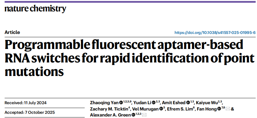 近日,亚利桑那州立和佛罗里达大学在杂志Nature chemistry上发表了一篇题为“Programmable fluorescent aptamer-based RNA switches for rapid identification of point  mutations”的文章。作者开发了基于核酸适配体的不含酶RNA开关FARSIGHTs,可以快速和多重检测几乎任何具有单核苷酸特异性的靶序列。FARSIGHT探针的激活可以在5分钟内发生,与上游扩增分离。将FARSIGHTs与等温扩增相结合,可以通过强荧光输出在 attomolar下检测单核苷酸突变。使用这种方法,作者从临床唾液样本的RNA中100%准确地区分出SARS-CoV-2 Omicron变体。FARSIGHTs可以很容易地重新编程以对新出现的病原体进行基因分型,在即时传染病监测和个性化医疗保健应用中具有潜在的用途。