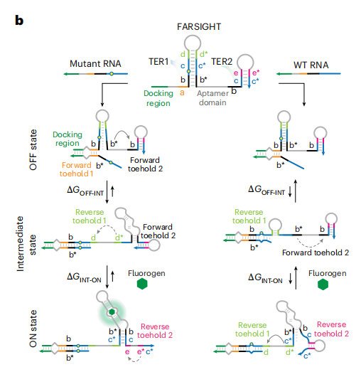 FARSIGHT 利用了一对耦合的toehold-exchange反应,将 RNA 结合与适体茎结构形成联系起来。在没有靶标RNA时,FARSIGHT探针的荧光RNA适配体的核心茎干被一个发夹结构锁住,处于“关闭”(OFF)状态,荧光背景极低。靶标RNA存在时,首先与探针上的“对接区域”稳定结合,发生‌第一步toehold-exchange反应,并确立了 FARSIGHT与靶标复合物的中间状态。若靶标是野生型(WT),即使仅有一个核苷酸不匹配,也会在中间态形成一个单核苷酸“鼓包”,造成能量惩罚,从而将平衡推回OFF状态,阻止后续激活。对于正确突变靶标,释放的单链域会启动第二轮toehold-exchange反应,会导至了‌荧光RNA适配体核心茎干的形成‌。一旦适配体正确折叠,即可结合其对应的荧光分子,生成强烈的荧光信号,进入“开启”(ON)状态(图b)。