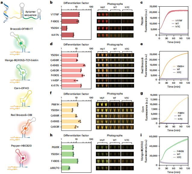FARSIGHT的设计兼容多种荧光RNA适配体-荧光分子对(如Broccoli、Corn、Red Broccoli、Pepper、Mango-III)。利用这些光谱可区分的输出信号,作者成功实现了‌在单管内同时检测2个、3个甚至4个不同的点突变(图b–i)‌。此外,通过将Mango-III适配体与生物素化荧光分子TO1-biotin结合,还实现了‌横向流动试纸条LFA‌的比色或荧光读出,为多重检测提供了更简便的方案。