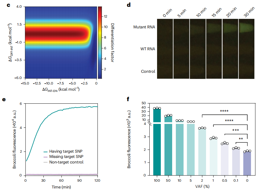 作者针对SARS-CoV-2 S 基因中的 P681R 突变位点设计了一个FARSIGHT检测。结果显示,引入突变 RNA 靶标后, FARSIGHT反应在 30 分钟内荧光显著增加,而野生型靶标则接近背景水平(图d、e),其 VAF 检测灵敏度可低至 0.1%(图f)。