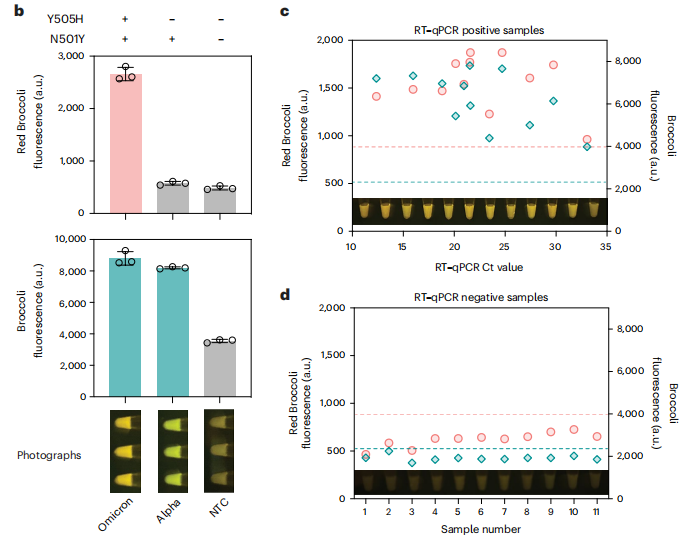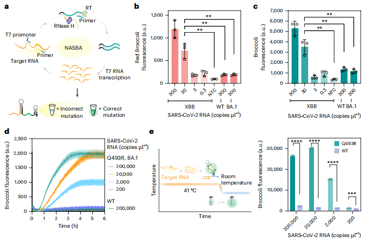 作者将基于NASBA的FARSIGHT双位点检测方案应用于实际的临床唾液样本。使用针对N501Y(主要变异株通用)和Y505H(Omicron特异性)的FARSIGHT,成功从12份阳性样本(经测序确认为Omicron BA.5)中检出病毒并准确分型(图c),与RT-qPCR结果完全一致,而11份阴性样本均无显著信号(图d)。