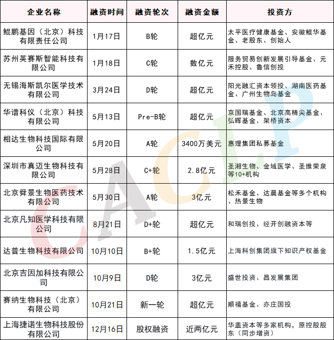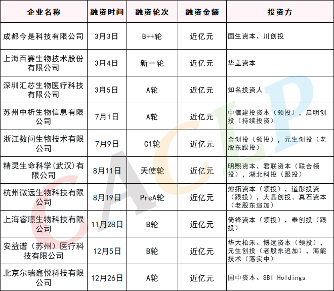 2025年度已披露的单轮融资过亿元的事件12起,获融资企业分别是鲲鹏基因、英赛斯、海斯凯尔、华谱科仪、相达生物、真迈生物、舜景生物、凡知医学、达普生物、吉因加、赛纳生物。近亿元的融资事件共10起,融资企业有今是科技、百赛生物、汇芯生物、中析生物、数问生物、精灵生命、微远生物、睿璟生物、安益谱、尔瑞鑫悦。千万级融资事件15起,另有11起融资事件未披露具体金额。