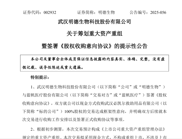 2025年12月30日,明德生物与蓝帆医疗分别发布公告,宣布签署《股权收购意向协议》,明德生物拟以现金收购蓝帆医疗全资子公司武汉必凯尔救助用品有限公司100%股权。两者合作看似和体外诊断毫无关联,不过明德除了IVD,还有急危重症信息化解决方案和ICL业务常被人忽略。 本次的收购意向就是急危重症信息化解决方案的渠道扩展,明德目前业务主要面向医疗机构,提供各类急危重症的诊断产品与方案;而必凯尔核心业务是急救包,并在此基础上拓展了应急装备、应急单品及应急服务等救护相关业务,通过收购必凯尔,明德生物能够将自身的诊断能力与必凯尔的现场救护产品相结合,为客户提供从院内到院前、从专业机构到工业场景的一体化解决方案。 而且后者拥有工业场景和商超场景,正在向居家场景扩展,家庭急救市场是一个尚待挖掘的蓝海。随着公众健康意识的提升和老龄化社会的到来,家庭常备急救用品正从可选消费品变为必需品,通过必凯尔已有的渠道和品牌,明德生物有望将其专业的医疗健康理念和产品带入千家万户,开辟“第二增长曲线。明德生物目前市值超40亿元,此次收购是其重要战略布局; 从“诊断”到“救治”的闭环 从上述内容,我们大略提取几个关键信息:“应用场景的扩增”,“诊疗一体化的实现”。 在“急危重症诊疗一体化”的战略构想下,通过快速诊断实现明德的第一步解决方案,这是其IVD企业的强项;而后及时的现场救治和解决,这在今天看来是愈发变得重要,通过此次收购(若成行),那么明德的诊断能力和必凯尔的现场救护产品就会充分结合,为客户提供一体化方案。 2025年,明德生物前三季度营业收入为2.27亿元,同比增长0.53%,归母净利润为1351.55万元,需开启新的增长热点。 必凯尔则相对稳定,2025年的半年报显示当期实现营业收入7580.13万元,净利润752.64万元,总资产2.28亿元,收入和净利率与去年同期基本持平,并且自动化研发、参与行业标准、技术转型等仍保持蓄势待发的状态,整体向上。 对于明德生物而言,收购必凯尔意味着可突破医院围墙,进入更广阔的市场空间。应急救护领域是政策驱动与需求扩容的双重爆发期,相关产业已形成万亿级产业规模;2024年我国安全应急装备重点领域产业规模已突破9200亿元,近三年年均增速稳定在10%左右,二者相结合,也可围绕急症救治形成生态闭环,打造区域产业集群。 财务改观 财务层面,必凯尔过往数年持续为母公司贡献稳定的净利润和经营现金流,此次收购成行的话,首先是明德生物的盈利水平将会提高,强化其在急危重症领域的市场地位与综合竞争力。 当然,相比于过去,必凯尔将得到更多的协同、赋能,以及订单量的助益。对必凯尔还能改善财务,两者同处武汉,有得天独厚的便利优势,双方资源整合融合过程中的许多问题将会第一时间得到重视。 从目前来看,不管是财务方面,还是战略发展上,这一起收购至少从理论上和表面上看都没问题,只要融合过程顺利基本能兑现预期。业务有上下协同,各取所需。 这就是市场资源的有效配置,2025年IVD行业并购活动频繁,企业纷纷通过外延式扩张寻找第二增长曲线,有透景生命拟分阶段收购康录生物82%的股份,总交易金额达3.28亿元;也有利德曼筹划以支付现金方式收购北京先声祥瑞生物部分股;还有生物梅里埃加码POCT赛道;以及快奥森多调整分子诊断战略聚焦床旁应用等等, 这些收并购有一个共同的特征是作为非核心业务去剥离,聚焦主营业务使其更好的发展,话说回来,剥离何尝不是一种成人之美,让这些业务去它该去的地方,实现另一种更好的发展,全链条布局正在出现向更“轻”、更“精准”的战略转型。 写在文末 目前交易仍是处于签署意向协议阶段,最终价格、业绩承诺等关键条款待定。 对明德生物而言,截至2025年三季度,账面货币资金为4.52亿元,收购的初步估值约为1.65亿元。因此,后续交易双方或将签署业绩承诺及补偿安排将成为看点。 参考资料: 1.重大资产重组!,中国基金报,2025 风险提示:股市有风险,投资需谨慎,以上内容仅供投资者参考,不作为投资决策的依据。 |