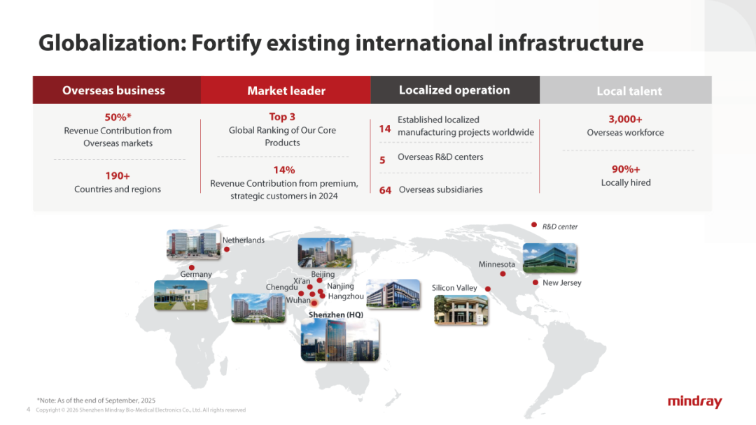 | 全球化蓝图、流水业务扩张、数智化转型的三角战略已经清晰地绘制在迈瑞医疗未来十年的增长版图上。摩根大通全球医疗健康大会上,迈瑞医疗首次系统公布了公司未来十年的增长蓝图。公司董事会秘书李文楣透露,公司未来增长将围绕“加速全球化”“流水业务拓展”“数智化转型”这三大核心支柱展开。  这不仅是迈瑞针对自身发展的战略升级,也透露出中国医疗器械龙头企业应对全球变局、提升国际竞争力的深层思考。迈瑞医疗全球化战略迎来新的里程碑。“加速全球化”被明确为公司未来增长的核心支柱。李文楣在演讲中透露,迈瑞医疗设定了清晰的全球化进阶目标:将国际业务收入占比从当前的50% 提升至 60% 以上。 这意味着未来迈瑞的国际业务比重将超过国内业务,这是其成为全球医械巨头的必经之路。迈瑞的国际业务版图已相当可观。截至目前,其产品和服务覆盖全球190多个国家和地区,已在全球40多个国家搭建起64家子公司、5个研发中心、14个生产基地的全球化网络。国际员工队伍突破3000人,其中90%以上为本地员工。“不同于传统跨国企业的营销导向模式,公司秉持深度本土化理念。”李文楣强调,在新兴市场,迈瑞尤其注重赋能本地医疗能力建设。例如在中东和非洲地区,已建立20多个超声培训学校,为当地培养并认证数千名超声临床医生。在关税、贸易壁垒与供应链风险加剧的背景下,加快建设海外平台成为国际业务长期主义的关键。李文楣表示,公司正通过推进本地生产、供应链采购与研发的全方位落地,稳步实现从单纯的医疗设备供应商向赋能全球医疗系统的战略合作伙伴转型。流水业务(或称耗材业务)是迈瑞医疗未来增长的第二个核心支柱。该业务涵盖IVD试剂、微创手术耗材、微创介入耗材、IT与用户服务等,2025年上半年已贡献公司总营收的40%。2024年,迈瑞体外诊断领域在国内可及市场的占有率不及15%,在全球可及市场中占有率约为4%;微创外科和微创介入在全球可及市场中占有率仅0.8%。李文楣坦言,除了IVD仍有巨大的市占率提升空间以外,公司的微创外科、微创介入等耗材业务目前的占有率甚至可以忽略不计,而这两块业务的合计市场容量大于IVD,行业仍有很大的成长空间。为加速流水业务突围,迈瑞正从全球供应链布局与业务生态构建双向发力。一方面,公司积极推进海外本地化供应链与生产设施建设;另一方面,精准布局赛道扩容。公司通过收购惠泰医疗成功切入心血管介入领域,同时规划构建涵盖经皮、经自然腔道、经呼吸道等多介入路径的“泛介入治疗”生态。在微创外科领域,在聚焦胸外科与普外科的基础上,进一步向妇科、泌尿外科等多科室延伸,并重点研发适配各科室临床需求的手术机器人。“数智化转型”是迈瑞医疗未来十年增长的第三大核心支柱。李文楣指出,迈瑞的数智化解决方案构建了清晰的五层架构。前四层已落地应用,第五层正处于研发攻坚阶段:第一层为设备基础层,第二层为设备融合层,第三层为IT系统层,第四层为AI层,第五层为闭环自强化层。2024年底,迈瑞推出了“启元”医学大模型家族,应用从重症监护拓展至围手术期、乳腺超声、妇产超声、IVD检验、医工管理等多个领域。据李文楣介绍,“启元”医学大模型具备双重核心能力:一方面可构建患者“数字孪生体”,另一方面能充当“智能医疗助手”。 提供7×24小时实时患者监护、自动生成精准临床文书,为多场景医护人员提供高风险场景下的关键决策支持。值得关注的是,所有AI大模型均采用本地部署模式,全力保障患者隐私安全。李文楣特别强调了“具身智能”在迈瑞未来战略中的核心地位。“具身智能”在“十五五”规划建议中被列为前瞻布局的未来产业之一。李文楣阐释了迈瑞对“具身智能”的理解:设备作为“感官”采集数据,IT系统作为“神经”传输整合数据,AI作为“大脑”生成辅助诊疗决策并反馈给设备硬件完成执行。未来“黑灯工厂”实验室、智能麻醉机器人、智能超声机器人等前沿产品将逐步在迈瑞落地。这些创新将直接挑战医疗领域的“不可能三角”——即质量、可及性与成本之间的传统矛盾。目前,迈瑞的数智化解决方案已在全球多个地区验证了其价值。在挪威,miCare与mWear可穿戴设备助力当地医院提升监护效率;在沙特,miImaging为全球最大虚拟医院提供支撑;在中国四川,miInnlab构建的“2+6+X”江油区检模式成为全国基层医疗协作标杆。在上海仁济医院,搭载“启元”医学大模型的数智医疗中心解决方案,使肝移植手术时间缩短约50%。李文楣在总结中强调,迈瑞医疗的三大增长支柱不是孤立的,而是相辅相成、协同发力的有机整体。全球化布局为流水业务拓展提供了市场基础,数智化转型则为两者注入了科技动能。这一战略规划的公布,标志着迈瑞医疗从中国领先的医疗器械企业向全球医疗科技领导者的转型已进入加速期。参考资料:迈瑞医疗