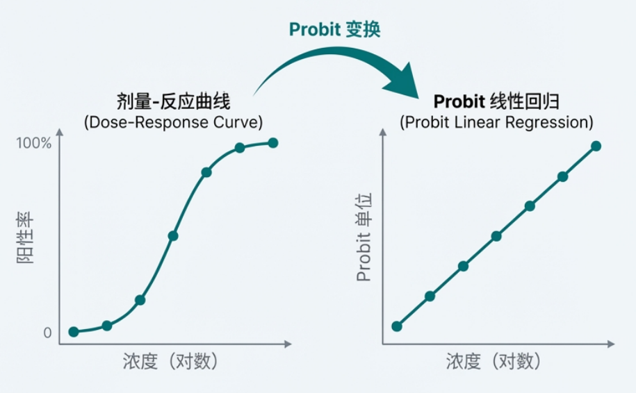 Probit 方法(概率单位法)是一种统计回归分析技术,专门用于处理二项分布数据。在核酸检测性能评估中,它通过建立被测物浓度检出概率(阳性阳性率)之间的函数关系,来推断出特定检出概率下的浓度阈值。