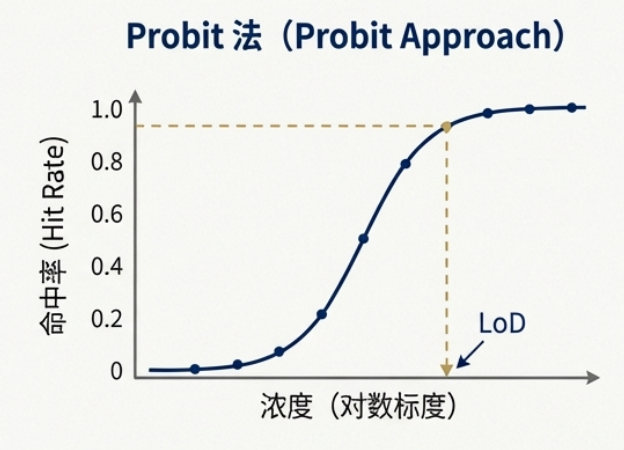 Probit 方法是一种统计回归分析技术,核心在于将非线性的“浓度-概率”关系转化为线性的数学模型。主要用于评估分子测量程序(如核酸检测或传染病检测)的检测限 (LoD),这些程序的检测能力以阳性率(即阳性结果数与重复测试总数之比,也称为 Hit Rate)来衡量,。