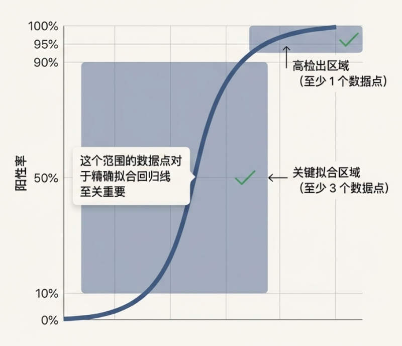 稀释梯度的设计直接决定了 Probit 回归的拟合质量。如果所有数据点都是 100% 或 0% 检出,模型将无法收敛。因此要求: