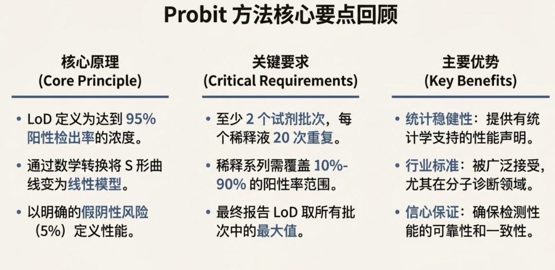 精确定义检测限(LoD)不仅仅是一个技术要求,它是确保诊断结果可靠性的基石。Probit方法提供了一个强大、标准化的框架,使我们能够以科学的严谨性和统计学的确定性,来证明和沟通我们检测能力的真实极限。