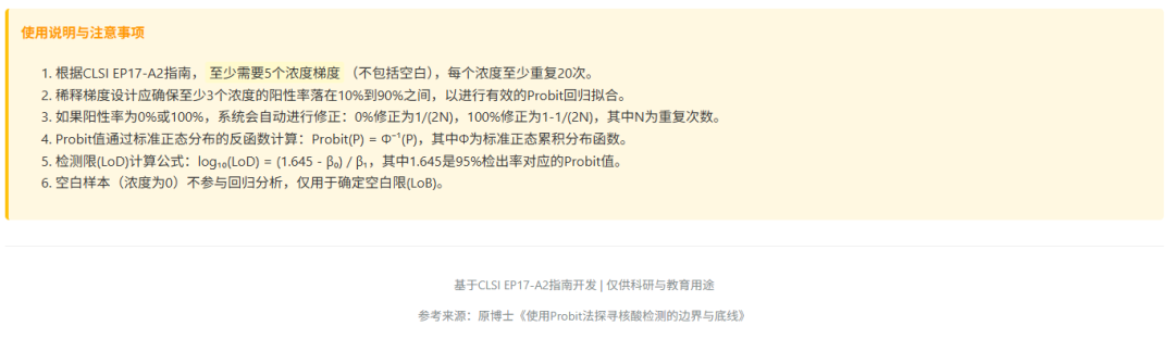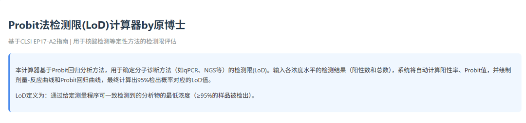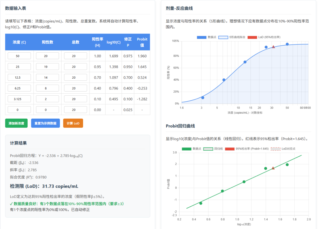制作了一个probit法计算最低检测限(LOD)的计算器,输入浓度、阳性数和总数就可以自动计算LOD并且绘制出剂量-反应曲线和probit回归曲线。大家可以用我的文章作为附件上传,让大语言模型生成一下。成功了记得打赏哦。