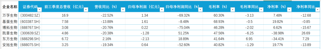 毛利率与净利率的表现进一步反映出经营质量的差异:基蛋生物以68.93%的毛利率居首且波动最小,安旭生物在毛利率下滑的情况下仍保持近20%的净利率,而东方生物虽毛利率逆势提升6.95个百分点,但净利率仍为34.41%,凯普生物净利率更是跌至-38.98%,给短期经营带来压力。
