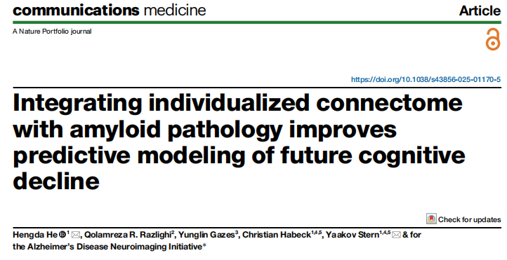 近日,美国哥伦比亚大学联合其他机构在杂志Communications Medicine上发表了一篇题为“Integrating individualized connectome with amyloid pathology improves predictive modeling of future cognitive decline”的文章。作者将Aβ病理的空间分布与个体大脑网络架构相结合,构建了基于网络的Aβ负担的指标。研究结果表明,将个性化的结构连接组而不是功能连接组信息纳入Aβ测量可以提高对预期认知衰退的预测性能。