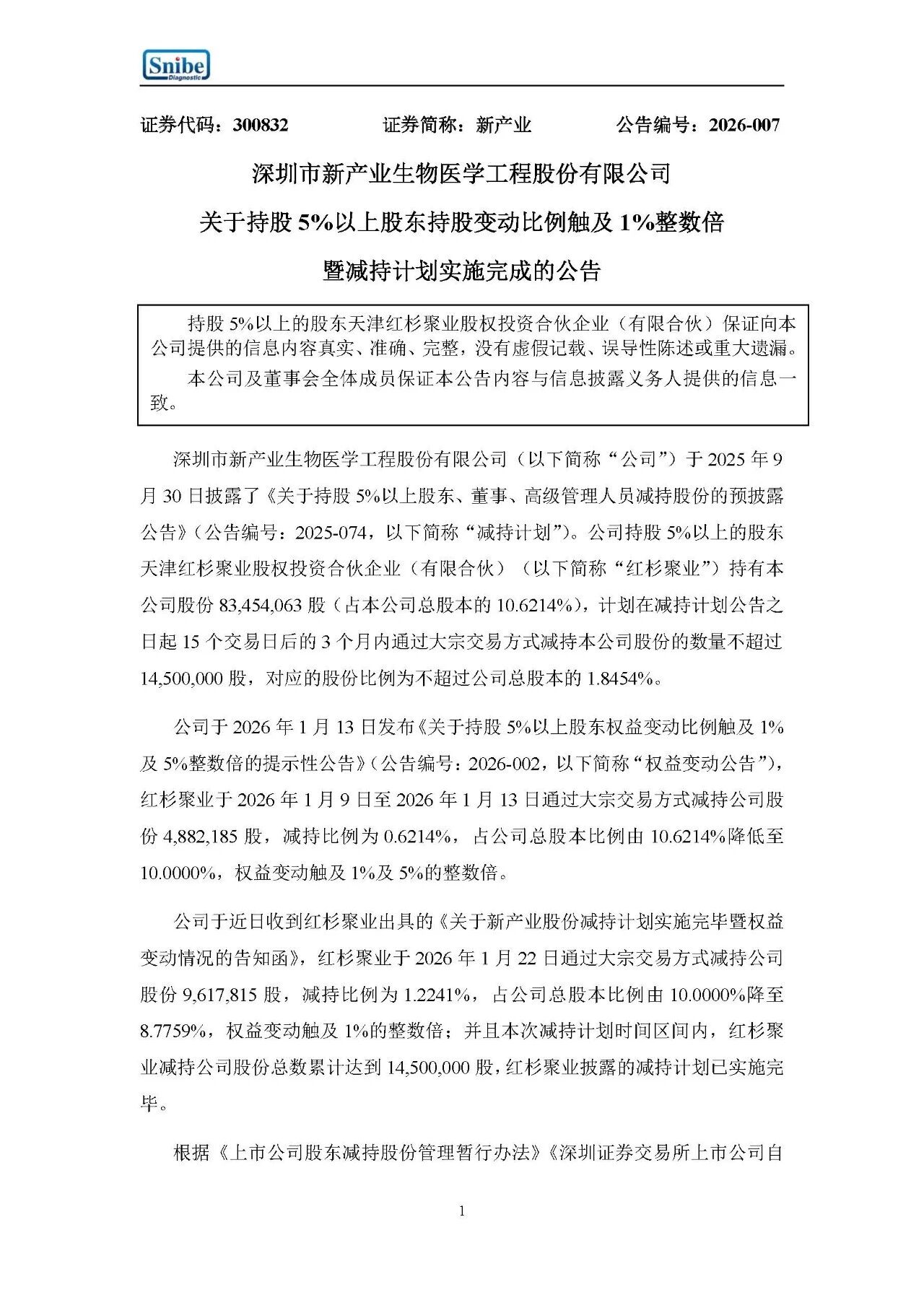 新产业于近日收到红杉聚业出具的《关于新产业股份减持计划实施完毕暨权益变动情况的告知函》,红杉聚业于2026年1月22日通过大宗交易方式减持公司股份9,617,815股,减持比例为1.2241%,占公司总股本比例由10.0000%降至8.7759%,权益变动触及1%的整数倍;并且本次减持计划时间区间内,红杉聚业减持公司股份总数累计达到14,500,000股,红杉聚业披露的减持计划已实施完毕。