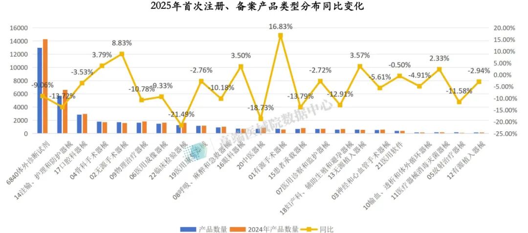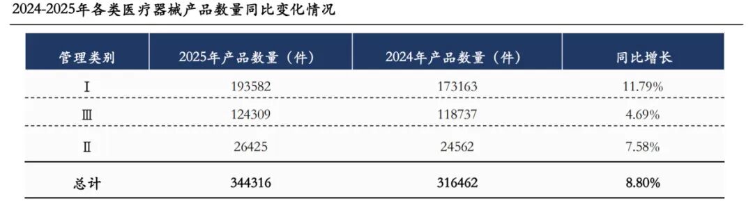 从产品结构来看,我国医疗器械产品数量持续扩容,Ⅰ类、Ⅱ类器械保持快速发展态势,Ⅲ类器械实现稳健增长,但高附加值的三类器械领域仍存在较大提升空间,产品原创性与创新性亟待加强。据统计,2025年底全国医疗器械产品总量达344316件,较2024年同比增长8.80%,其中Ⅰ类器械增幅最为显著;剔除体外诊断(IVD)品类后,各细分领域发展分化明显,近年来医疗器械年获批上市数量整体趋于谨慎,监管趋严的态势特征突出。