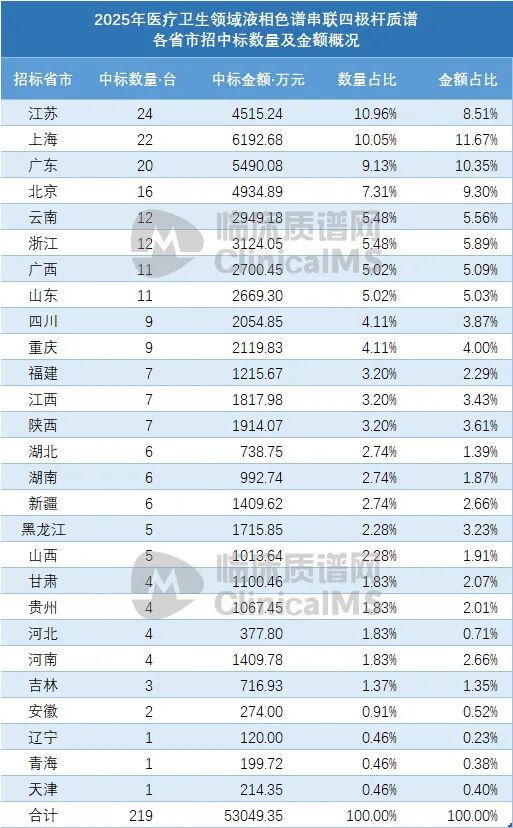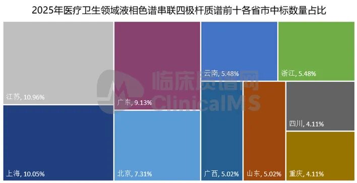 医疗卫生领LC-MS/MS 2025招中标数量前十的省份,临床质谱网制图