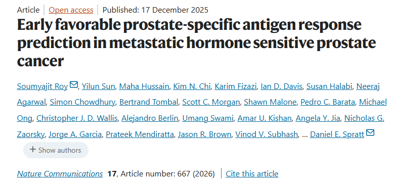 前言: 早期PSA(前列腺特异抗原)应答在mHSPC(转移性激素敏感性前列腺癌)治疗中有核心预后价值。无论是雄激素剥夺治疗(ADT),还是联合ARPI(雄激素受体通路抑制剂)或多西他赛,在治疗启动后6个月内PSA降至≤0.2 ng/mL,已被证实与显著改善的总生存期(OS)密切相关。对于治疗后PSA应答不佳的临床状态,可能需要考虑早期强化治疗或加入临床试验。然而,等待6个月才能评估PSA的谷值可能延误及时的干预时机,在此期间疾病可能进展至更具治疗抵抗性的状态,从而削弱后续治疗强化的潜在获益。现有的常规风险分层方法,如传统影像学,在预测早期PSA应答方面准确性有限。超过一半具有良好PSA反应的患者具有高体积的转移病灶,而近三分之一具有不理想PSA反应的患者则具有低体积的病灶。 近日,来自全球多所顶尖大学和癌症研究中心的庞大研究团队在杂志Nature Communications上发表了一篇题为“Early favorable prostate-specific antigen response prediction in metastatic hormone sensitive prostate cancer”的文章。本研究利用四项III期随机试验中容易获取的临床和实验室数据,开发并验证了 “NADIR”逻辑回归模型。该模型能够有效预测mHSPC患者在启动ARPI治疗后6个月内实现PSA≤0.2 ng/mL这一有利早期应答的概率,并且该预测概率与患者的总生存期显著相关。根据预测概率的分层显示,PSA 反应率分别为 92%、74%和 39%。此模型有潜力整合到临床决策流程中,助力实现更早期的风险分层和治疗策略选择,最终可能改善mHSPC患者的临床结局。