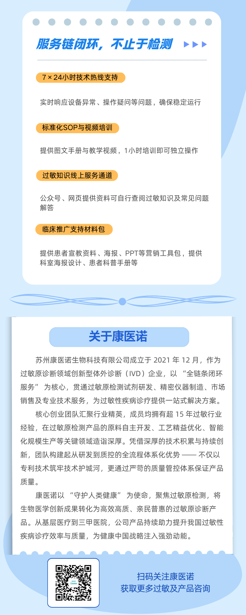 康医诺不仅提供国内独家过敏原快检产品,更为过敏性疾病诊疗打造一站式解决方案,从产品到市场,康医诺将一直伴随您左右。