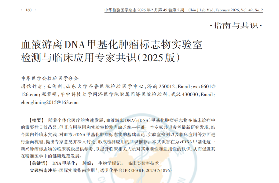 DNA 甲基化作为一种表观遗传调控机制,在基因表达调控中发挥重要作用,同时也是肿瘤发生发展的重要分子标志1‑2。肿瘤 DNA 甲基化标志物在肿瘤筛查、辅助诊断及预后评估等临床实践中展现出应用潜力 。随着液体活检的快速发展,采用体液分析个体的癌症分子特征成为热点 。血液标本取样便捷、存储方便,能够相对广泛地反映身体的生理病理状况,是临床检验应用最为广泛的标本类  DNAcirculating  free  DNA cfDNA)甲基化的肿瘤标志物,因其具有高灵敏性、非侵入性、可溯源、可动态监测等优势,在液体活检领域展现出广阔的应用前景3 目前国内外针对血液 cfDNA 甲基化肿瘤标志物检测,尚未形成统一的临床应用规范与标准化检测体系,这在一定程度上制约了该技术在临床场景中的规范化推广与应用。