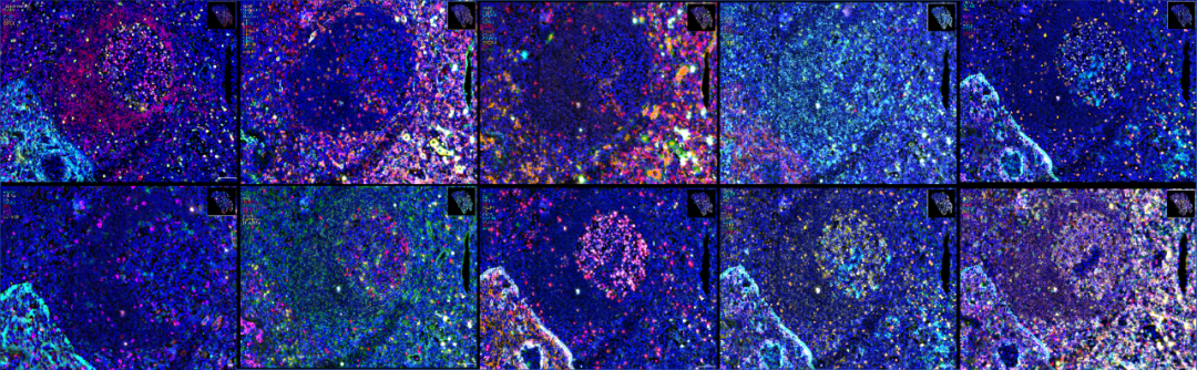 肺腺癌(左)与扁桃体(右)FFPE样本多重染色结果 100plex超高重染色,分组展示结果(扁桃体FFPE样本) 100plex超高重染色,分组展示结果(肺腺癌FFPE样本) 单次实验,全景解析——让研究者在一张切片上,同时获得肿瘤身份、免疫全景、微环境特征、治疗靶点、耐药机制等多维度信息,并保留所有信息的原始空间位置关系。 华大智造高级副总裁杨梦博士表示:“病理学已迈入多模态信息融合的加速轨道。在AI技术的驱动下,超多靶标的精细化应用正成为现实,让空间标志物的潜力得以充分释放,从而深度赋能临床诊断、预后和预测的精准化。华大智造始终秉持“生命科学核心工具缔造者”的使命,致力于打造能够高效解码生命多组学的智能工具,推动行业全面进入智能化、全景化的普惠新时代。” PMIF-20RS是华大智造推出的全流程空间蛋白组学解决方案,优势在于:染色技术温和,高效实现百重检测,智能驱动数据洞察——它为解码肿瘤免疫微环境、绘制神经环路图谱、解析发育与疾病时空动态提供了前所未有的工具支撑,正驱动病理学从平面形态观察迈向空间精准解析的新时代,为精准医学与转化研究注入核心动能。