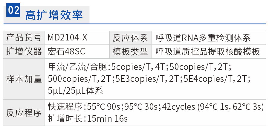 MD2104-X体系在呼吸道引探中扩增效率表现良好,各通道扩增效率均在95-105%之间,R2系数均在0.998-0.999。