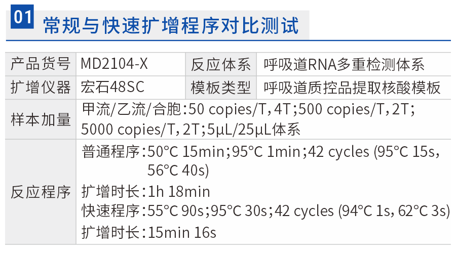 在呼吸道四重检测体系下,宝锐生物MD2104-X快速扩增试剂15min程序与常规程序相比Ct≤2,可正常检出靶标。