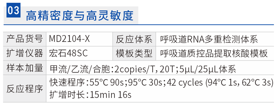 呼吸道四重检测体系下,MD2104-X体系对极限浓度样本均能全检20/20,且各通道CV值均小于3%,灵敏度和精密度表现良好。