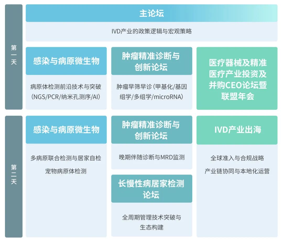 本届大会通过“主论坛+分论坛”的专业框架,并携手重磅合作伙伴医疗器械及精准医疗产业与投资联盟,深度整合产业资本与前沿技术资源,全方位覆盖行业前沿阵地。内容涵盖IVD产业政策逻辑与宏观策略解读,深度聚焦感染与病原微生物前沿技术(NGS/PCR/纳米孔测序)、院外检测与居家自检、肿瘤精准诊断(甲基化/基因组学/多组学/microRNA)以及长慢性病居家检测等技术突破,并开辟“IVD产业出海”专题,针对全球准入、合规策略及本地化运营进行权威拆解,构建起从技术创新到资本赋能、再到全球市场的全方位闭环体系。