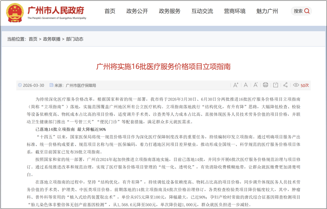 3月30日,广州市医保局发布《广州将实施16批医疗服务价格项目立项指南》。