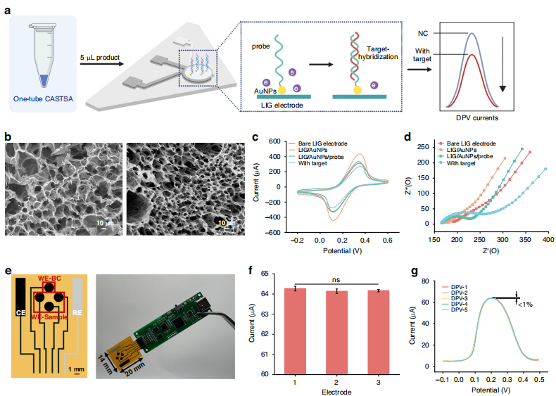 为了进一步提升检测的实用性和实现即时检测(POCT),研究团队设计并构建了一个‌基于激光诱导石墨烯(LIG)的电化学生物传感器平台(图a)‌。这种‌高灵敏电化学检测‌,有效消除了复杂样本基质在荧光检测中可能产生的背景干扰,提高了灵敏度。为了解决非特异性吸附的问题,作者还使用了‌独特的四电极阵列设计(图e)‌,其中三个工作电极修饰了特异性探针,第四个作为未修饰的空白对照电极,用于实时扣除背景和非特异性吸附信号,大大提高了测量的准确性和重复性(图f和g)。
