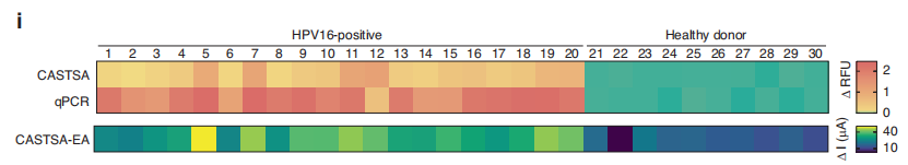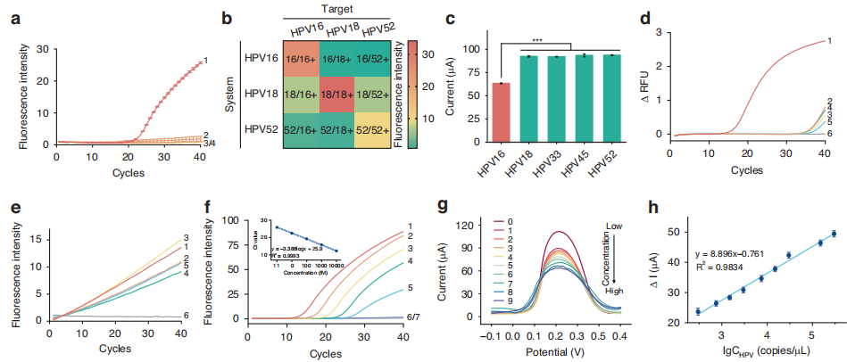 作者使用人工合成的HPV 16模板测试CASTSA 系统的敏感性,结果显示,CASTSA显示出优异的灵敏度。在10 pM至1 fM浓度范围内,Ct值与模板浓度的对数呈良好的线性关系(图 f)。结合电化学检测时,CASTSA检测限(LOD)达到‌18拷贝/反应(图h),超过了基于荧光分析的灵敏度(LOD 为 30 个拷贝/反应)。