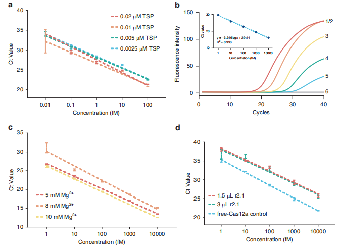 作者尝试将tsPCR 和 CRISPR-Cas 切割整合到单管中。然而,两种反应的缓冲液组成,特别是镁离子(Mg²⁺)的浓度不同。过量的Mg²⁺会导至 PCR 中的非特异性扩增,而Mg²⁺浓度不足则会抑制 Cas12a 的活性。作者测试了2 mM至10 mM的Mg²⁺浓度。结果显示,‌5 mM Mg²⁺‌能够在保证Cas12a活性的同时,避免PCR产生非特异性扩增,是单管反应的最佳平衡点(图c)。