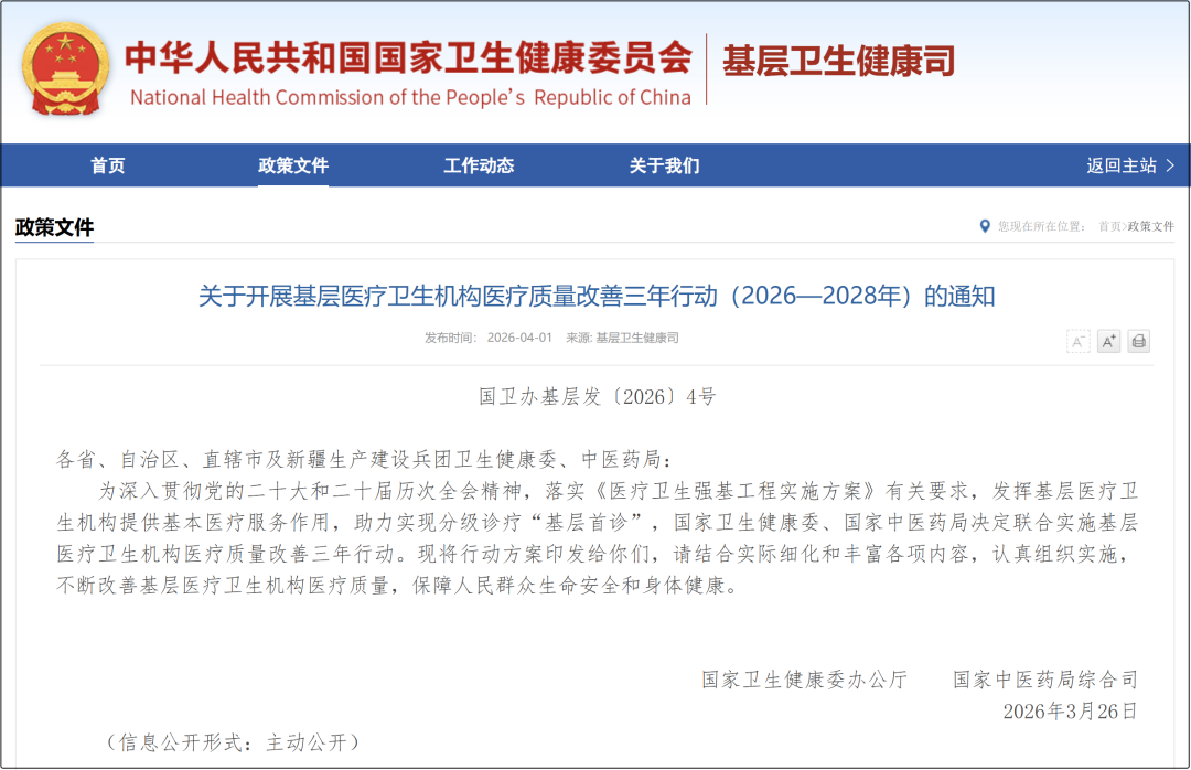 4月1日,国家卫生健康委办公厅、国家中医药局综合司联合发布《关于开展基层医疗卫生机构医疗质量改善三年行动(2026—2028年)的通知》。