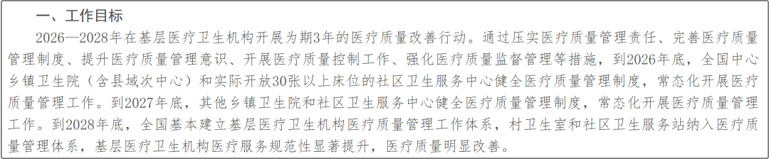文件明确提出:到2026年,中心乡镇卫生院和部分社区中心完成制度建设;到2027年全面覆盖乡镇与社区;到2028年延伸至村卫生室与社区站点,形成完整的基层医疗质量管理体系。