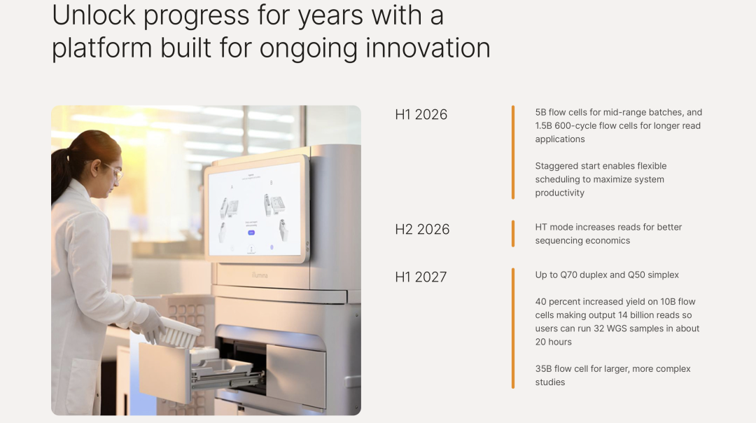 2026H1,将推出全新的50亿(5B)Reads 流动槽,以及支持更长读长的15亿(1.5B)Reads 600-cycle 试剂盒;2027H1,Simplex Sequencing Q50、Duplex Sequencing Q70;流动槽产出将提升最高达40%,运行时间减少约 30%。标准的10B 流动槽产出将增至 140亿 Reads,周转时间不到20小时。最大规格的流动槽产出将提升至350亿 Reads。