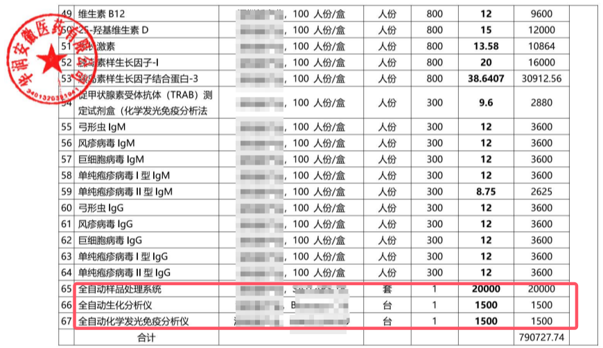 此次中标内容不仅涵盖常规生化、免疫试剂,还打包了整套检验设备及配套耗材。其中,某品牌全自动生化分析仪中标价仅为1500元、600速全自动化学发光免疫分析仪同样为1500元,一套生化免疫流水线系统报价为20000元。