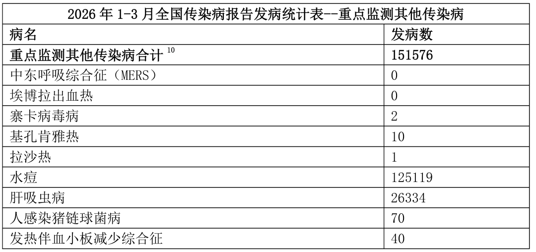 2026 年 1-3 月全国甲乙类传染病共报告发病 836723 例,鼠疫、霍乱、传染性非典型肺炎等多种传染病无病例报告。发病数前 10 的病种如下:梅毒161768例, 肺结核160195例, 乙型肝炎328749例, 新型冠状病毒感染63675例,淋病28252例,布鲁氏菌病12661例,艾滋病10294 例,猩红热5603例,细菌性和阿米巴性痢疾4666例,百日咳2273例。 2026 年 1-3 月全国丙类传染病合计发病 2977738 例,其中流行性感冒发病数最高,达 2235702 例,占比显著;其次为其他感染性腹泻病 610107 例、手足口病 111456 例,为丙类高发传染病。流行性腮腺炎 14109 例,急性出血性结膜炎 4814 例,包虫病 1126 例,其余病种如风疹、黑热病、麻风病发病数均不足 200 例,丝虫病报告数为 0,整体疫情呈集中高发态势,流感、腹泻病为防控重点。 2026 年 1-3 月全国重点监测其他传染病的发病合计发病151576 例。水痘为绝对高发病种,报告 125119 例;其次为肝吸虫病 26334 例,两者为该类疾病的主要构成。低发 / 输入性疾病为发热伴血小板减少综合征、人感染猪链球菌病病例数较少;寨卡病毒病、基孔肯雅热、拉沙热仅为零星个例报告。零发病种:中东呼吸综合征(MERS)、埃博拉出血热报告数为 0,烈性境外传染病无输入流行迹象。 |