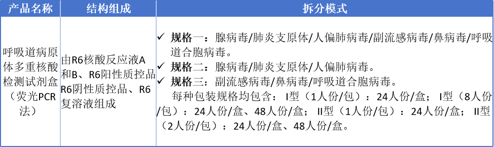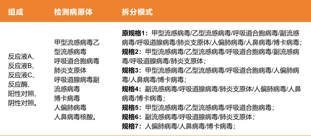 • 原有的6联检单一规格的基础上,拆分出两个独立的3联检规格:腺病毒/肺炎支原体/人偏肺病毒,以及副流感病毒/鼻病毒/呼吸道合胞病毒。