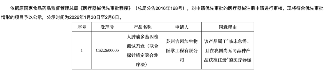 京圈的京,是南京的京” “皇冠上的明珠,被两波人同时盯上了”肿瘤NGS大panel,指的是一个注册证上“有一级变异”、“可报告二级变异”、且“技术要求中包含三级变异”的肿瘤NGS试剂盒。这就是大panel的定义,这个定义如果不小心伤害到了谁,现在关掉这篇文章还来得及。正因为这个苛刻的定义,大panel从一开始就被视为肿瘤NGS注册的珠穆朗玛峰。PS:这篇仅代表个人观点。如果我俩理解不一样,那么你是对的。欢迎留言区探讨。昨天,CMDE公示了2026年第十一批“医疗器械优先审批申请审核结果”。先声诊断的“人类多基因联合检测试剂盒(可逆末端终止测序法)”上榜!跟我们这个赛道有关系的是「(一)2、(一)5、(二)」这三条。「(一)5」一般属于“之前没有被注册过的、新的伴随诊断变异”,是一个first in class。比如年初进入优先审批通道的燃石乳腺癌CDx(PIK3CA/PTEN/AKT1)和吉因加胆管癌CDx(FGFR 1/2/3)。「(一)2」则属于“虽然没有新的伴随诊断变异”,但是在产品形态或者排列组合上玩出了新花样,是一个me better。先声诊断这次进入优先审批的就是个大panel,100%确定。但亲戚和克隆是两码事,美帝的Kit和东大的Kit也可能并不一样,所以:1. 下证的版本会有500+基因吗(一级+二级+三级)?2. CDx label能超过2个吗?会是泛实体瘤吗?这个感觉有难度,NTRK 1/2/3被世和几乎垄断了5. 会有TMB吗?如果有的话,会是一级变异还是二级变异?这可能取决于KN035那个TMB-H适应症能否获批。“医疗器械优先审批程序”和“创新医疗器械特别审查程序”,有什么差异?创新审查程序重在“全程辅导”,就像大家出去玩时找的陪玩。代表产品还没递交注册申请,对于某些挑战特别大的品种,甚至可能注册临床试验的方案都还没定。优先审批程序则是“加速通道”,就像很多景点的VIP专属通道。代表产品的注册临床试验已经做完了,正式递交了注册申请。历史的经验显示,进入优先审批程序后,拿证的周期大约在12-18个月。先声好事将近,谁最着急?每次聊NGS大panel的话题,我在世和的朋友们就会表示不开心。在世和眼里,自己的TMB是基于检测425个基因算出来的,这就是个大panel。在我眼里,一个没有一级变异、没有二级变异的试剂盒, 连个正经小panel都不算。先声已经拿到了优先审批,到时候下证了肯定会疯狂宣传“真正的NGS大panel第一证”,那可就太难受了。世和,迫切的想要保卫住自己的“大panel第一证”名号。而保卫的最好办法,就是把它真正的变成大panel。本来我是不知道的,直到昨天晚上,我梦到了一只狐狸。它说我早八辈子在雪山上救了它,现在它来还愿,让我说出一个愿望。我说我想知道世和有没有在尝试扩展TMB试剂盒的预期用途。世和已经/计划启动临床试验,目标是对获批的“非小细胞肺癌组织TMB检测试剂盒”的预期用途进行变更。一级变异:肺癌增加ALK/MET/EGFR,肠癌增加KRAS,胃癌/乳腺癌增加ERBB2扩增,泛实体瘤增加NTRK1/2/3。二级变异:肺癌14个、肠癌12个、胃癌9个、乳腺癌11个、泛实体瘤4个。如果去看历史上出台的审评指导原则,它们都有一个共性:而他们探路的过程,会被总结成经验,成为审评指导原则。所以大家觉得京圈双雄谁能率先拿到真正的大panel第一证?(选偷家的朋友们,留言区说说谁偷家?)