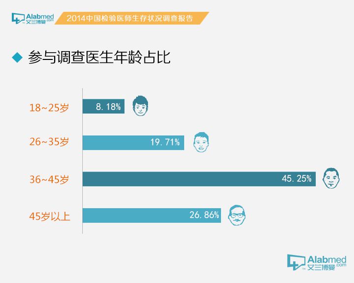 一般资料参与本次调查活动的检验医生中 18~25岁的占26.86%、26~35岁的占45.25%、36~45岁的为19.71%、45岁以上的8.18%;