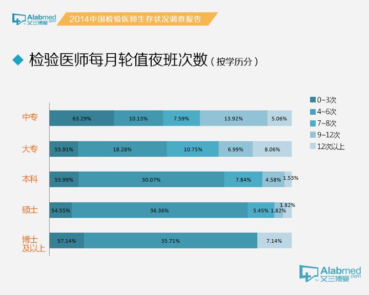 关于值夜班的次数 每月值夜班0~3次的检验医生占56.49%,4~6次的占24.41%,7~8次、9~12次、12次以上的分别占8.68%、6.03%、4.39%。其中,45岁及以上检验医生每月值夜班≤3次者达83.75%,远高于其他年龄段;独立医学实验室检验医生每月值夜班≥12次者达21.92%,远高于其他性质单位;实习医生/实习技师每月值夜班≥12次者达10.37%,远高于其他职称的医生;工作经验1年以下的检验医生每月值夜班≥12次者达9.09%,远高于其他工作年限的医生。