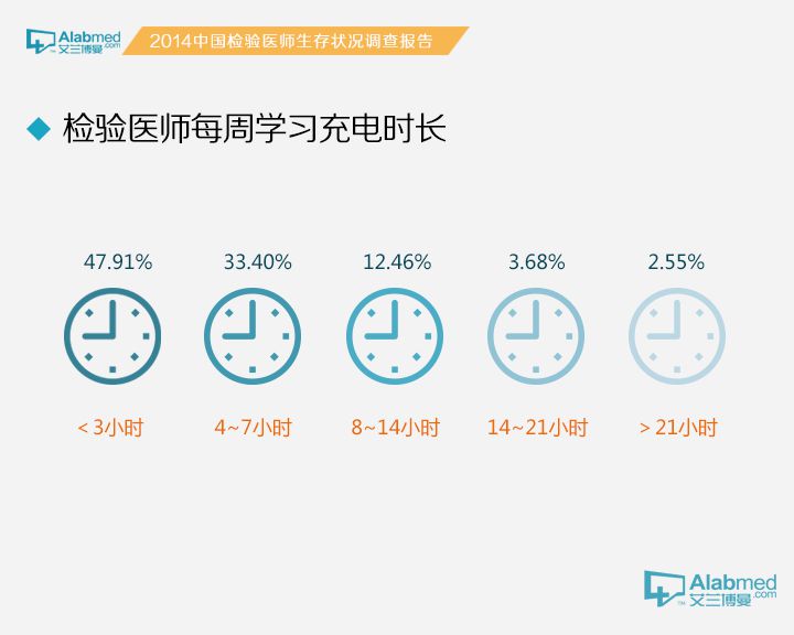 检验医生的学习情况 参与调查的检验医生中,每周学习时间小于3小时的占47.91%、4~7小时的占33.40%、8~14小时的占12.46%、15~21小时的占3.68%、21小时以上的占2.55%。 特别爱学习的检验医生包括外企/合资医院的医生(每周学习8小时以上的占50%)、副主任医师/副主任技师(35.49%)、工作年限1年以下的医生(30.69%),均远高于平均值(18.69%);最爱学习的检验医生是博士学历的检验医生,每周学习15小时以上的占28.58%,是平均值(6.23%)的4倍多。