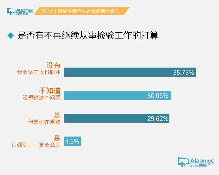 是否有不再继续从事检验工作的打算 对于是否有不再继续从事检验工作的打算,选择“很强烈,一定会离开的”占4.60%,选择“是,但是还在观望”占29.62%,选择“不知道,没想过这个问题”占30.03%,选择“没有,我会坚守这份职业”的占35.75%。按照年龄划分,年龄在45岁以上的检验医生,选择“没有,我会坚守这份职业”的高达63.75%,远高于18~25岁(35.36%),26~35岁(27.54%)和36~45岁(43.52%)年龄段检验医生。