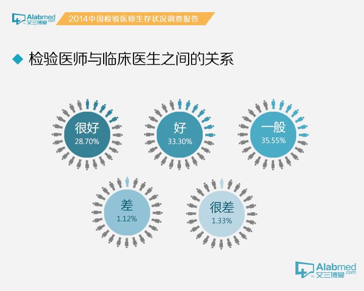 检验医生与临床医生之间的关系 检验医生与其他科室的医生关系如何呢?28.70%的检验医生认为很好、33.30%的认为好、35.55%认为一般,认为差或很差的分别有1.12%和1.33%。值得注意的是,三级医院的检验医生和副主任医师/副主任技师,认为很好的仅有13.12%和9.68%;博士及以上学历的检验医生,认为很差的高达7.14%。