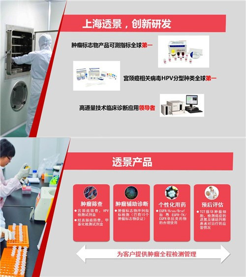 图片说明:资料图片 癌症重在预防和早发现,已成为大众的共识。上海透景生命科技有限公司致力于癌症的早期检测工作,其检测手段已经覆盖中国人群常见10余种恶性肿瘤。该公司所采用的技术基于2008年诺贝尔奖获得者的科学发现,对宫颈癌的预测尤为准确,只需无痛收集宫颈表面细胞,就可以告知被测得宫颈癌发生的可能性,从而可以采取有针对性的治疗措施,将这一危害广大妇女生命安全的凶手扼杀在摇篮里。 上海立迪生物技术有限公司:基因不同,诊疗有异 同样的癌症患者采用同样的诊疗手段,疗效却相差甚远。患者之间的个体差异影响诊疗效果,医疗观念的进步越来越呼唤“个体化诊疗”。上海立迪生物技术有限公司掌握了最先进的建立肿瘤患者个体化动物模型技术,即把患者的肿瘤移植到免疫缺陷小鼠体内,在小鼠体内重建患者的肿瘤,然后在动物体内进行药物敏感性检测,为临床个体化治疗方案的选择提供理论依据,从而提高用药的成功率、延长患者的生存周期、并改善患者的生活质量。 上海宝藤医学检验中心:有没有乳腺癌,定期血检可知道 现代先进的分子医学技术可以通过基因检查个人乳腺癌倾向,对易感人群可以通过抽血检测超早地诊断乳腺癌,而在患者治疗过程中及康复以后,都可以通过检测血液中癌细胞残留情况,对其癌症的治疗效果和复发与否进行评估,进而采取有效的治疗方案,避免无效治疗或者复发的悲剧。上海宝藤医学检验中心拥有成熟的乳腺癌“无创”筛查及精准诊疗技术,已经为全国超过400家大型三甲医院的逾10万患者提供了个体化“订制”诊断服务,在治疗过程中定期抽血进行检测,可以知道癌细胞有没有被杀死或者重生。