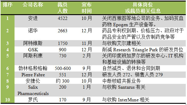 近日,GEN网站选出了2014年裁员最“狠”的十大公司。虽然2014年前十位公司裁员的总数(12206)比2013年的28112人要减少很多,但是生物制药公司裁员依然以各种理由进行裁员,包括需要挽回专利悬崖带来的损失、渴望更高的效率、通过重组并购获得更大的发展机会等等。下表为这十家公司的裁员情况: