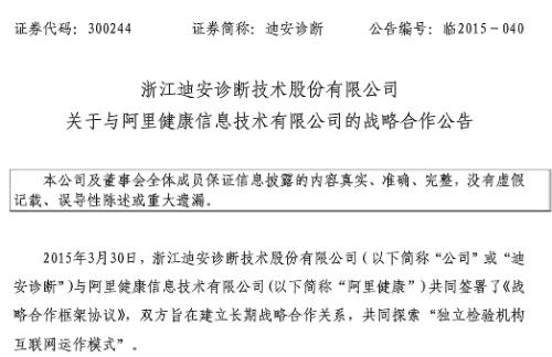 2015年3月30日,浙江迪安诊断(300244,咨询)技术股份有限公司(以下简称“公司”或“迪安诊断”)与阿里健康信息技术有限公司(以下简称“阿里健康”)共同签署了《战略合作框架协议》,双方旨在建立长期战略合作关系,共同探索“独立检验机构互联网运作模式”。